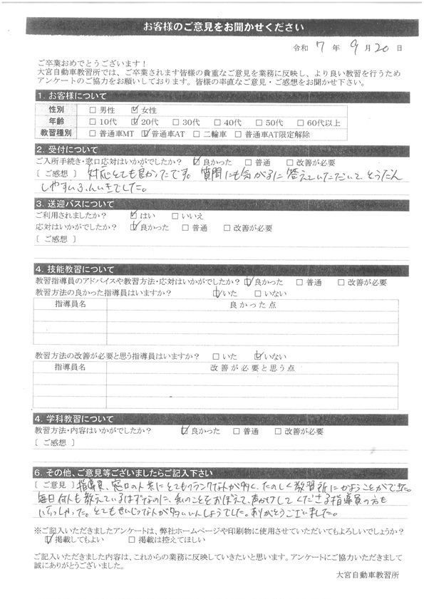 大宮自動車教習所では、卒業時にアンケート協力をいただいています。