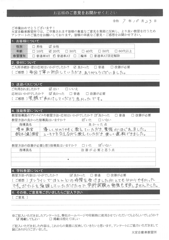 大宮自動車教習所では、卒業時にアンケート協力をいただいています。
