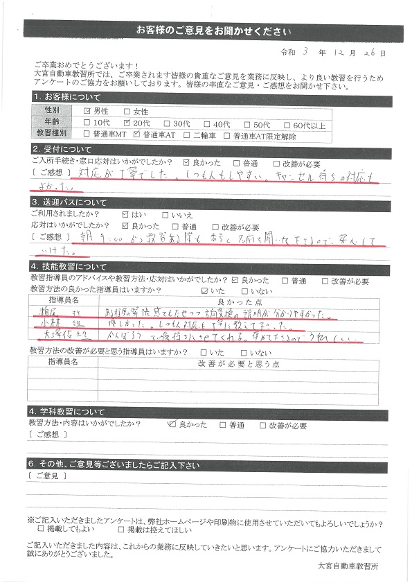大宮自動車教習所では、卒業時にアンケート協力をいただいています。