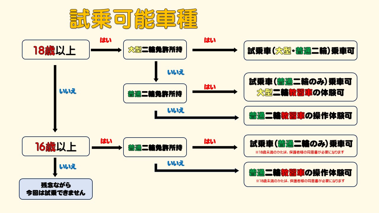 ※令和6年9月3日に【試乗会に参加をされる方・・・】の4.についてと、【16歳以上の方で自動二輪免許をお持ちでない方】について、赤字部分を追加修正させていただきました。よろしくお願いいたします。