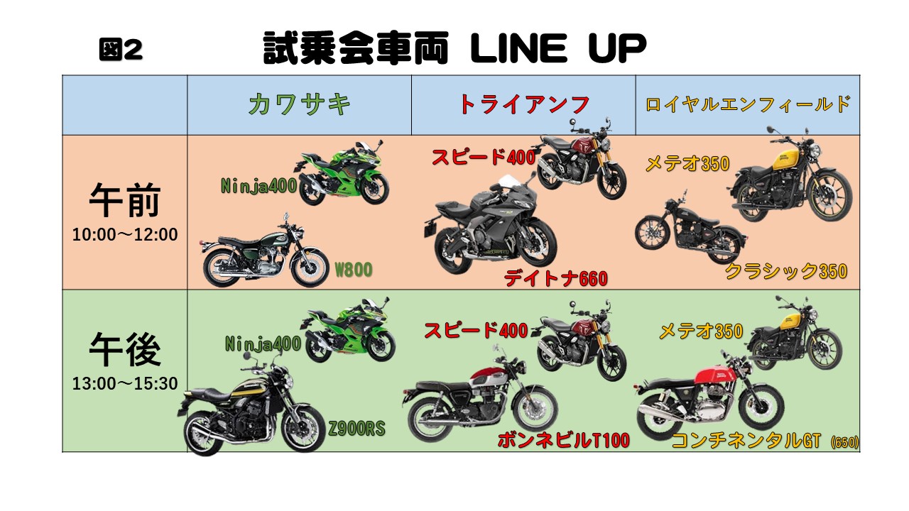 ・二輪試乗会は雨天決行ですが、雷雨・豪雨等の場合は二輪試乗会を中止する場合があります。