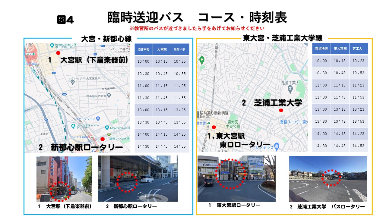 ・駐車場に限りがございます。試乗会当日は、大宮駅・新都心駅コースと東大宮駅・芝浦工業大学コースに送迎バスを運行いたしますのでぜひご利用ください。送迎バスの「時刻表・停車場所(赤丸が停車場所になります)」は図4になります。