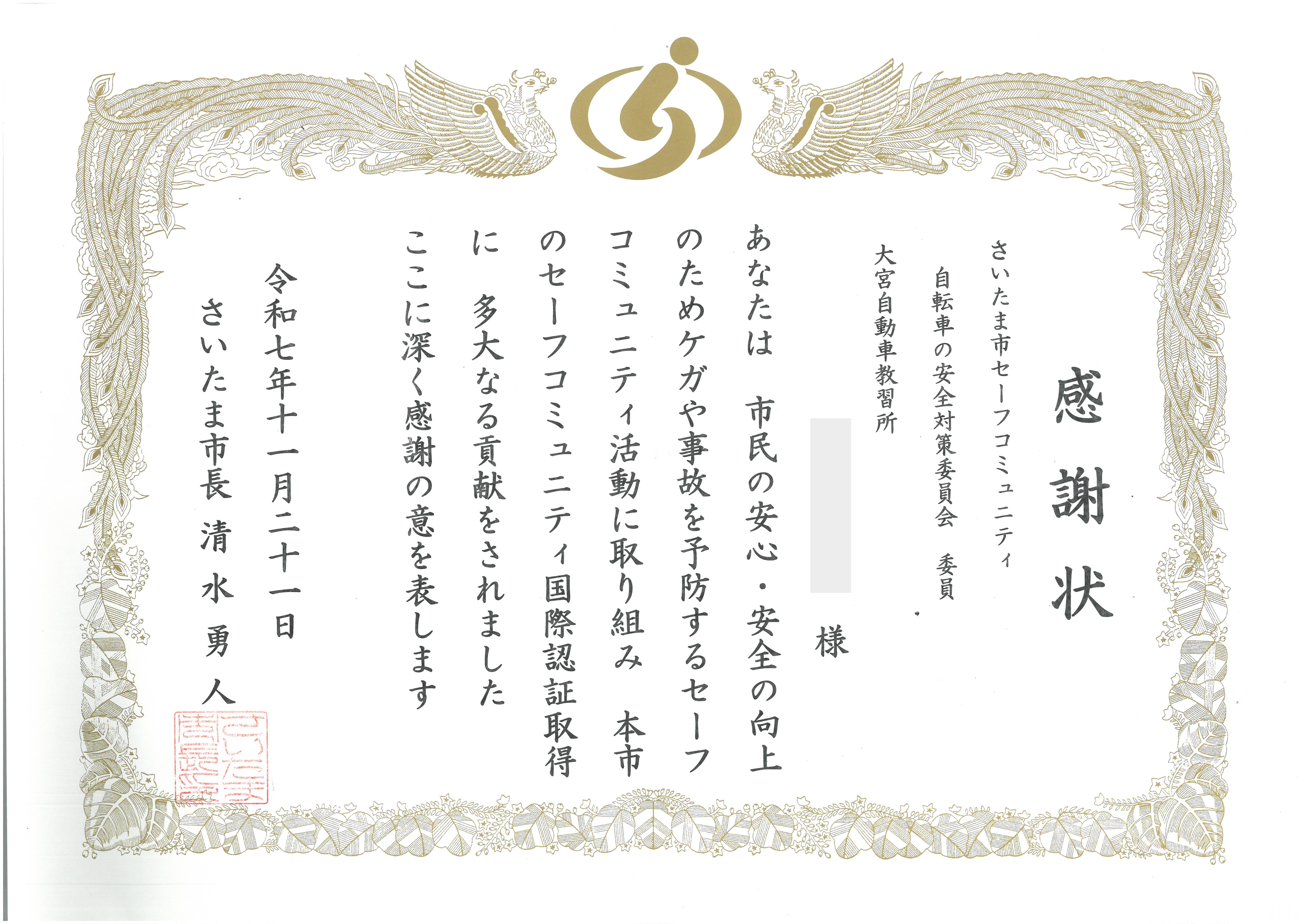 大宮自動車教習所は、さいたま市セーフコミュニティ活動開始当初(2016年4月)よりさいたま市に協力しており、前回の認証式典(2019年11月)の際にも市長から感謝状を授与されました。