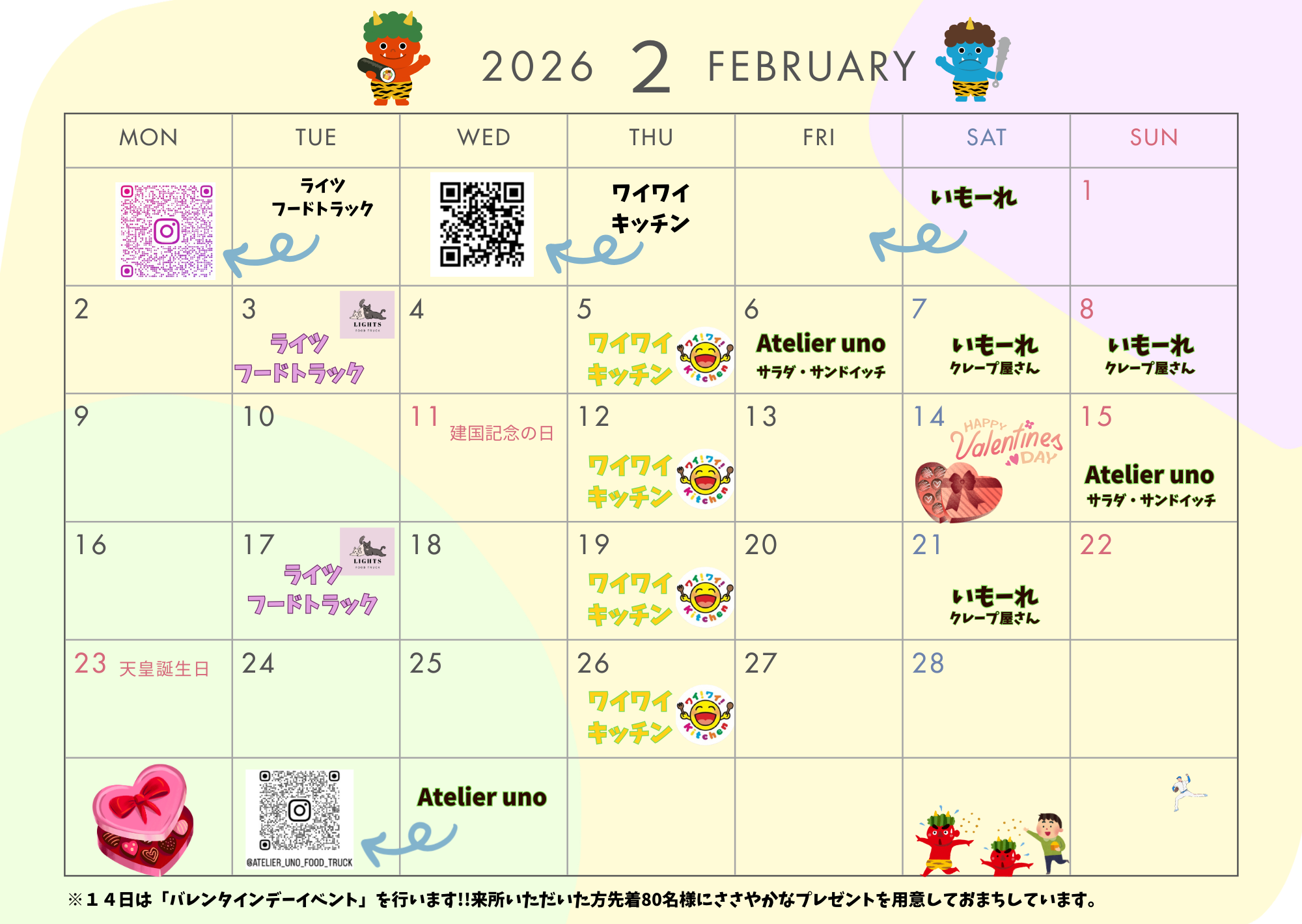 令和8年2月のキッチンカー出店カレンダー(最新)です