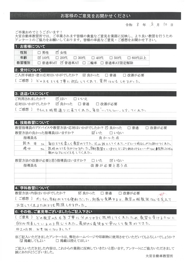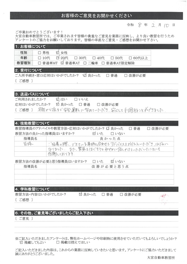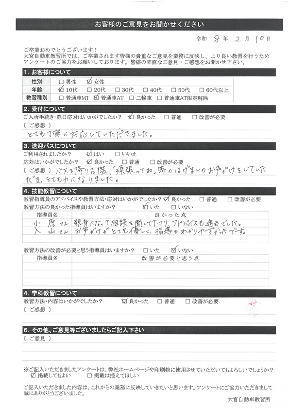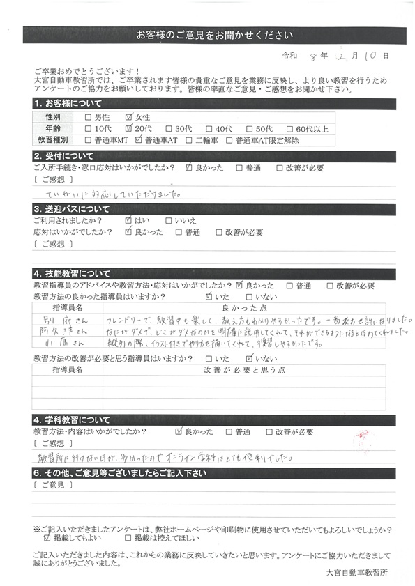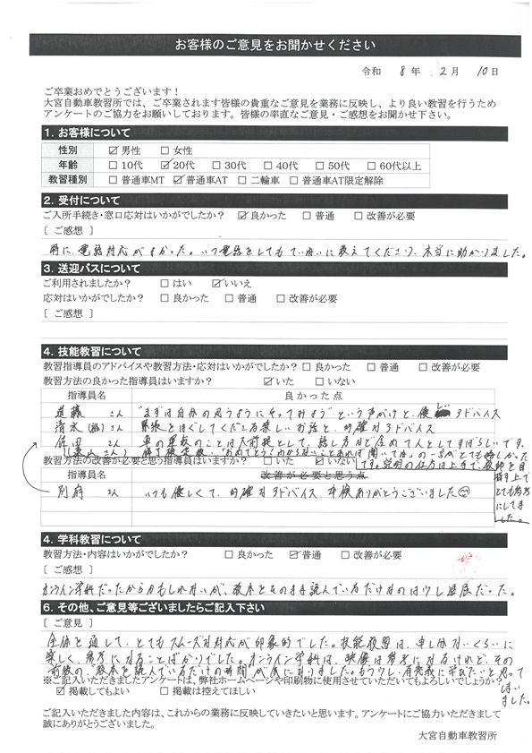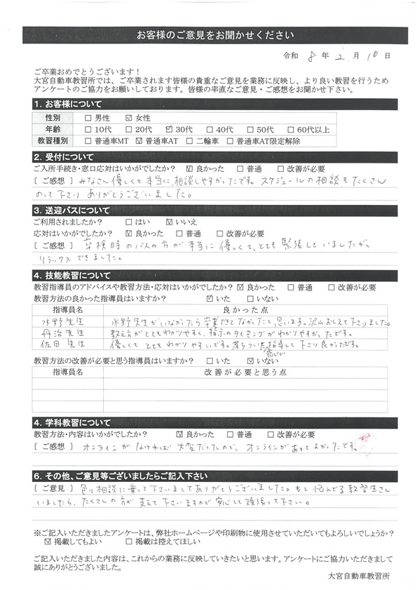 大宮自動車教習所では、卒業時にアンケート協力をいただいています。