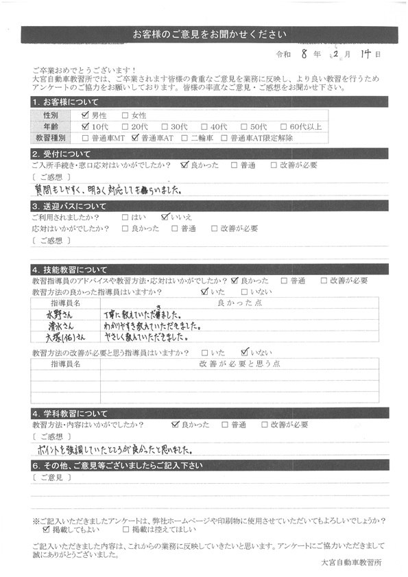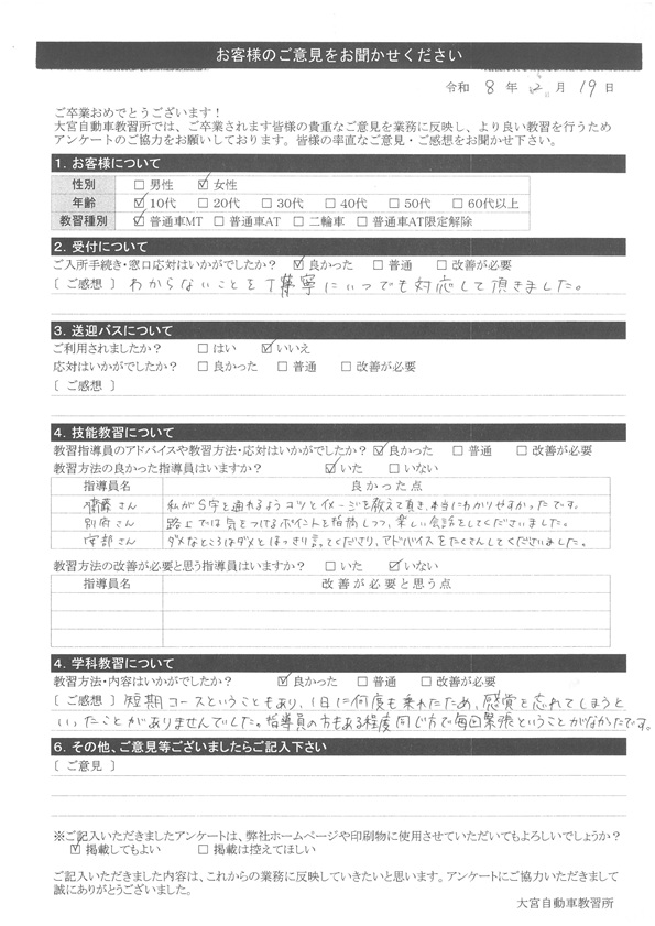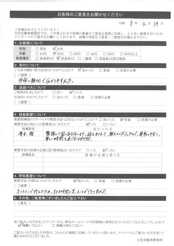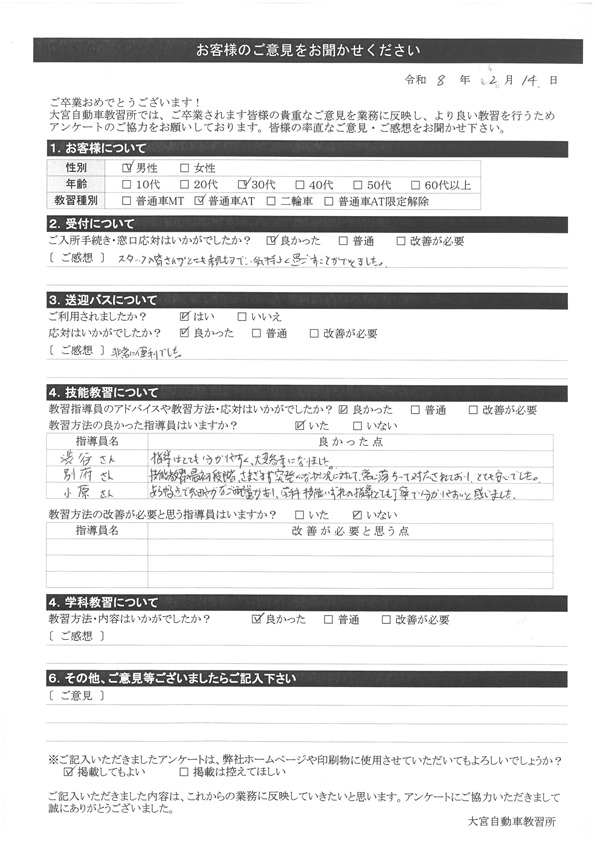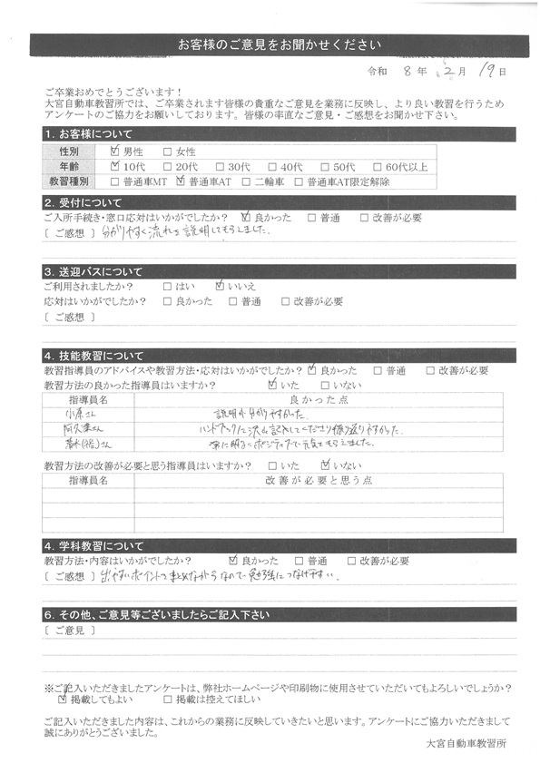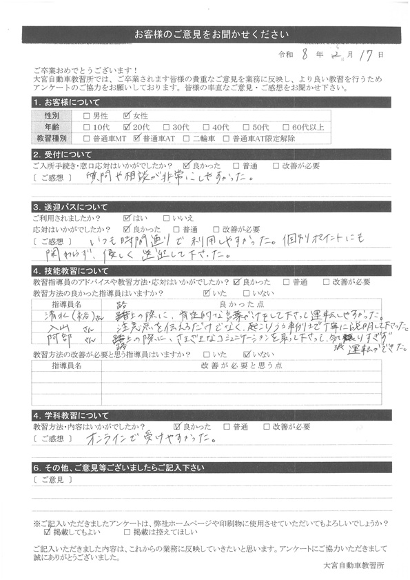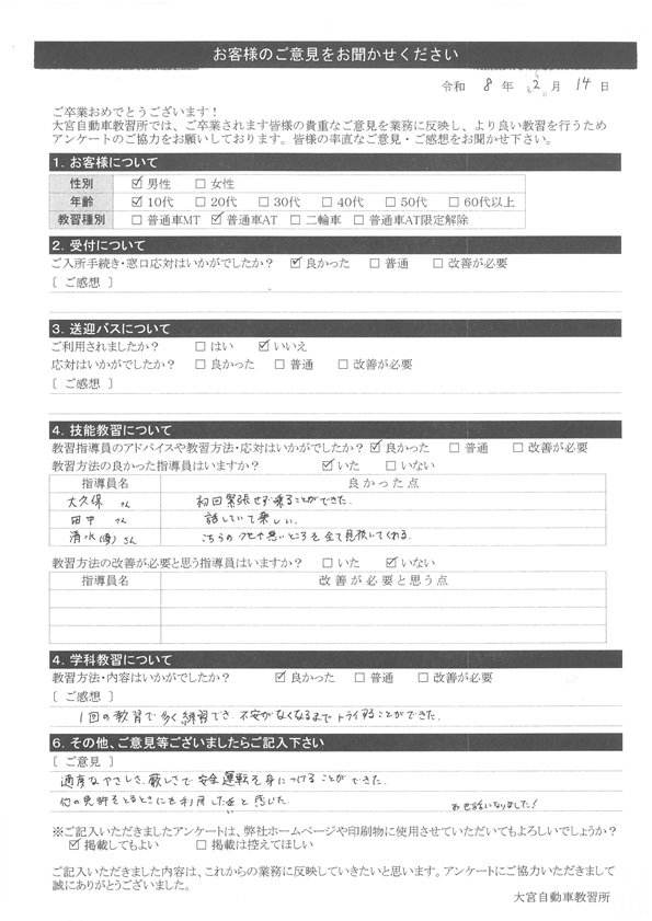 大宮自動車教習所では、卒業時にアンケート協力をいただいています。
