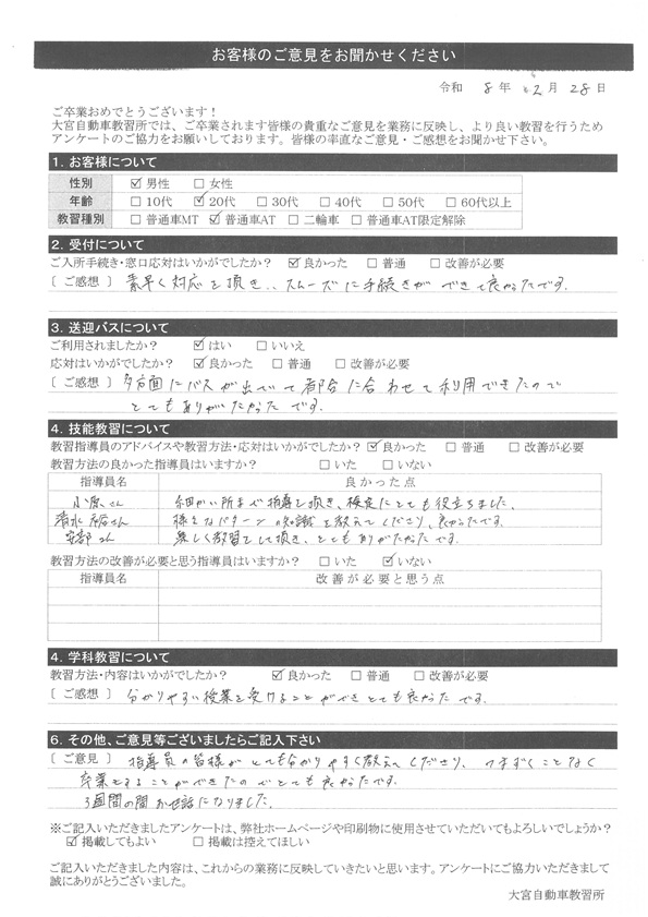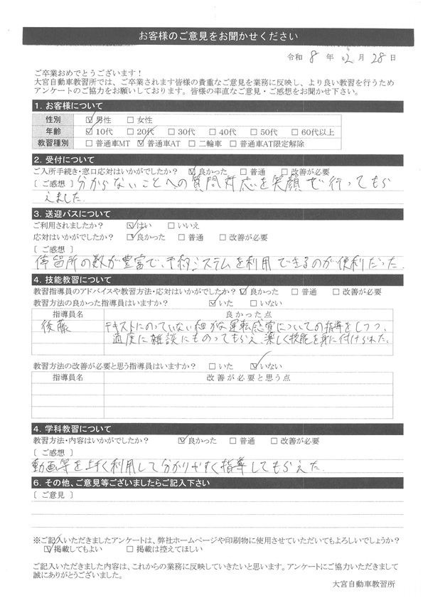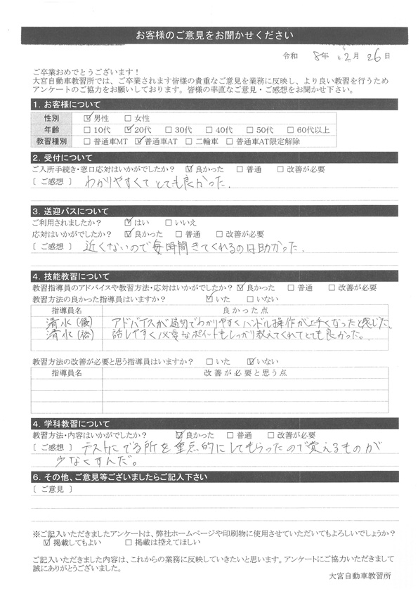 大宮自動車教習所では、卒業時にアンケート協力をいただいています。