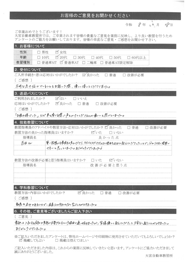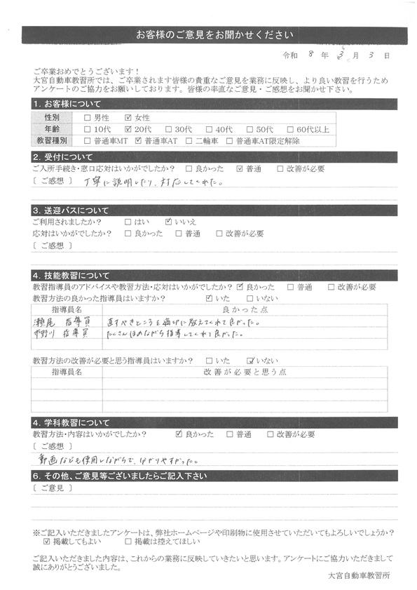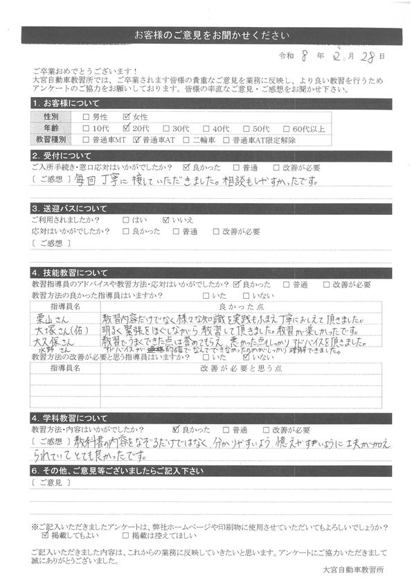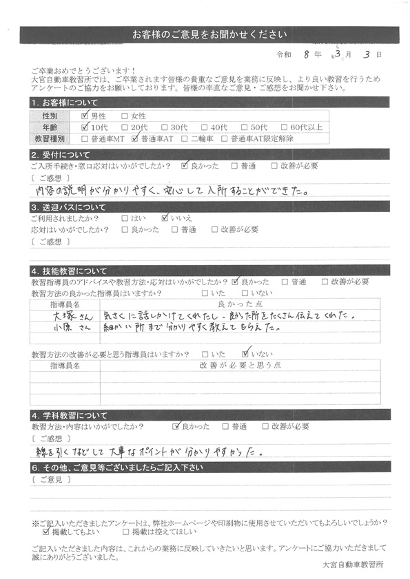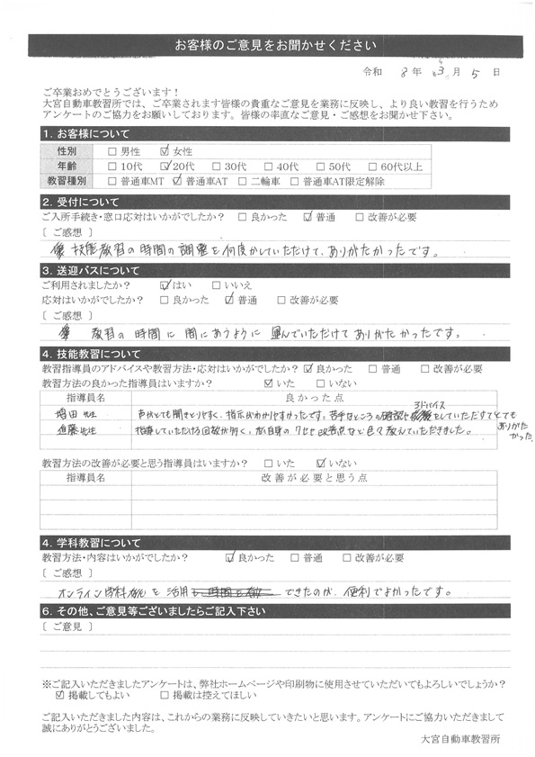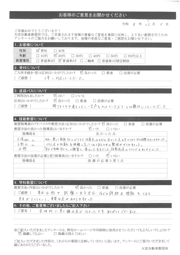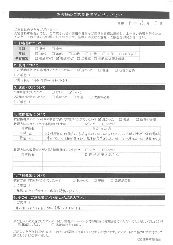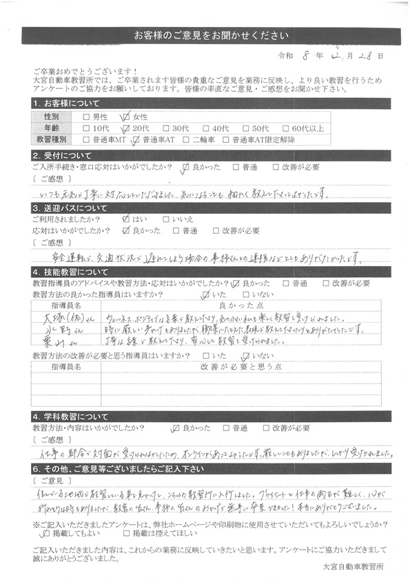 大宮自動車教習所では、卒業時にアンケート協力をいただいています。