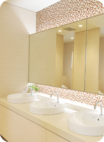 化粧室はオシャレな色調で清潔