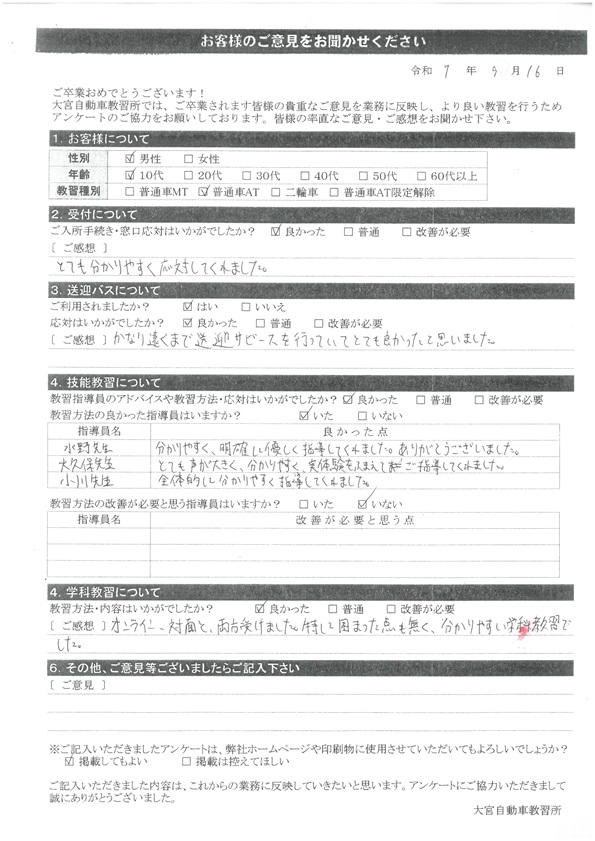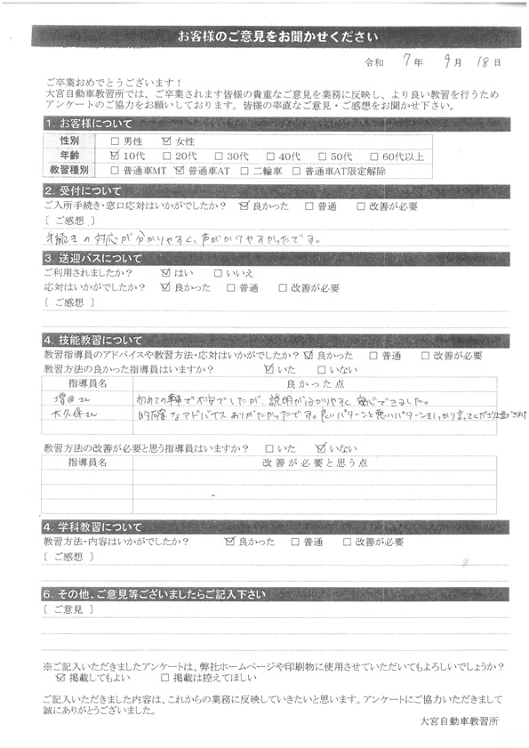 大宮自動車教習所では、卒業時にアンケート協力をいただいています。