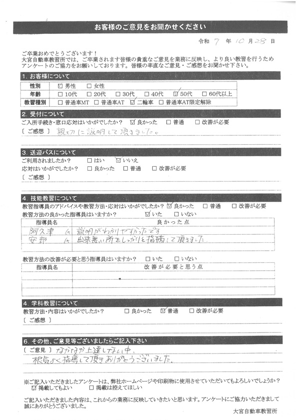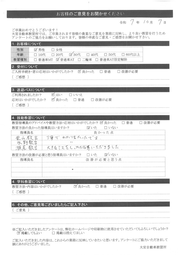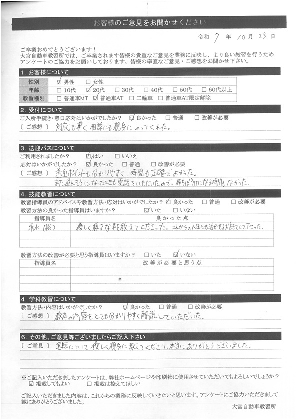 大宮自動車教習所では、卒業時にアンケート協力をいただいています。